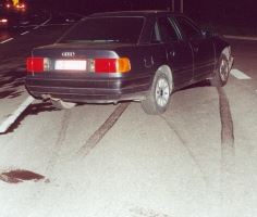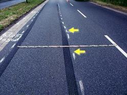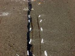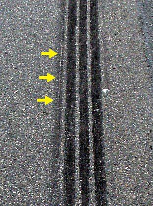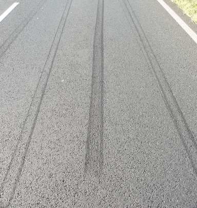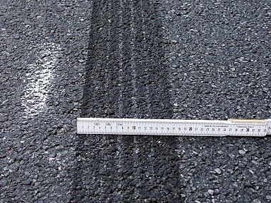 Dieses Foto zeigt eindrucksvoll den Unterschied zwischen Blockierspuren auf alten Fahrbahnen mit geringem Bitumengehalt und neueren Fahrbahnen (hier Flickstelle) mit hohem Gehalt an Bitumen. Die von hieraus rechte Spur geht über beide Fahrbahnbereiche, aber nur der Spurenbereich auf der neuen Fahrbahn zeichnet sich durch den höheren Bitumengehalt deutlich ab.