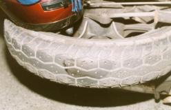 Eventuell ist auf der Reifenlauffläche noch die Stelle zu erkennen, mit der der Reifen während der Blockierung auf der Fahrbahnoberfläche gerieben hatte.