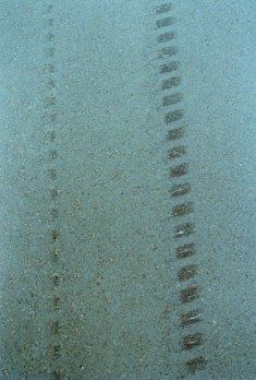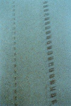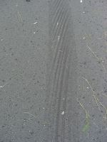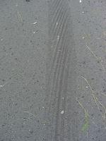 Das Querprofil des Reifens zeichnet sich bei ungebremsten Rädern in Strichen quer zur Fahrtrichtung ab, wogegen die Striche umso schräger verlaufen, je stärker das Rad abgebremst wird.