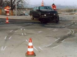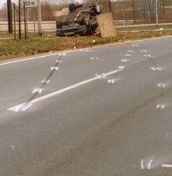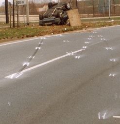 Rotationsschleudern eines Fahrzeuges kann z. B. nach exzentrischer Kollision zweier Fahrzeuge auftreten, ohne dass es ungünstiger Fahrbahn-, Geschwindigkeits- bzw. Witterungseinflüsse bedarf. Rotationsschleudern können nach Fahrzeugkollisionen festgestellt werden innerhalb der Strecke zwischen Kollisionsort und dem Fahrzeugendstand.