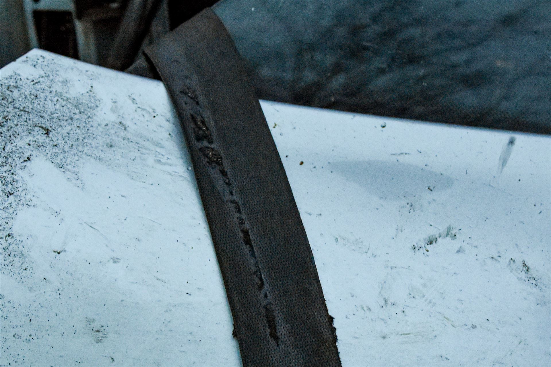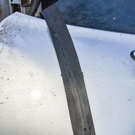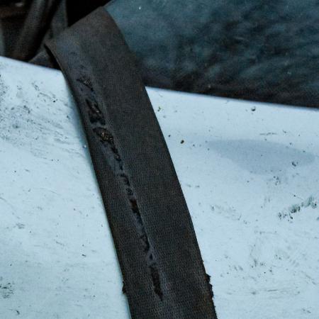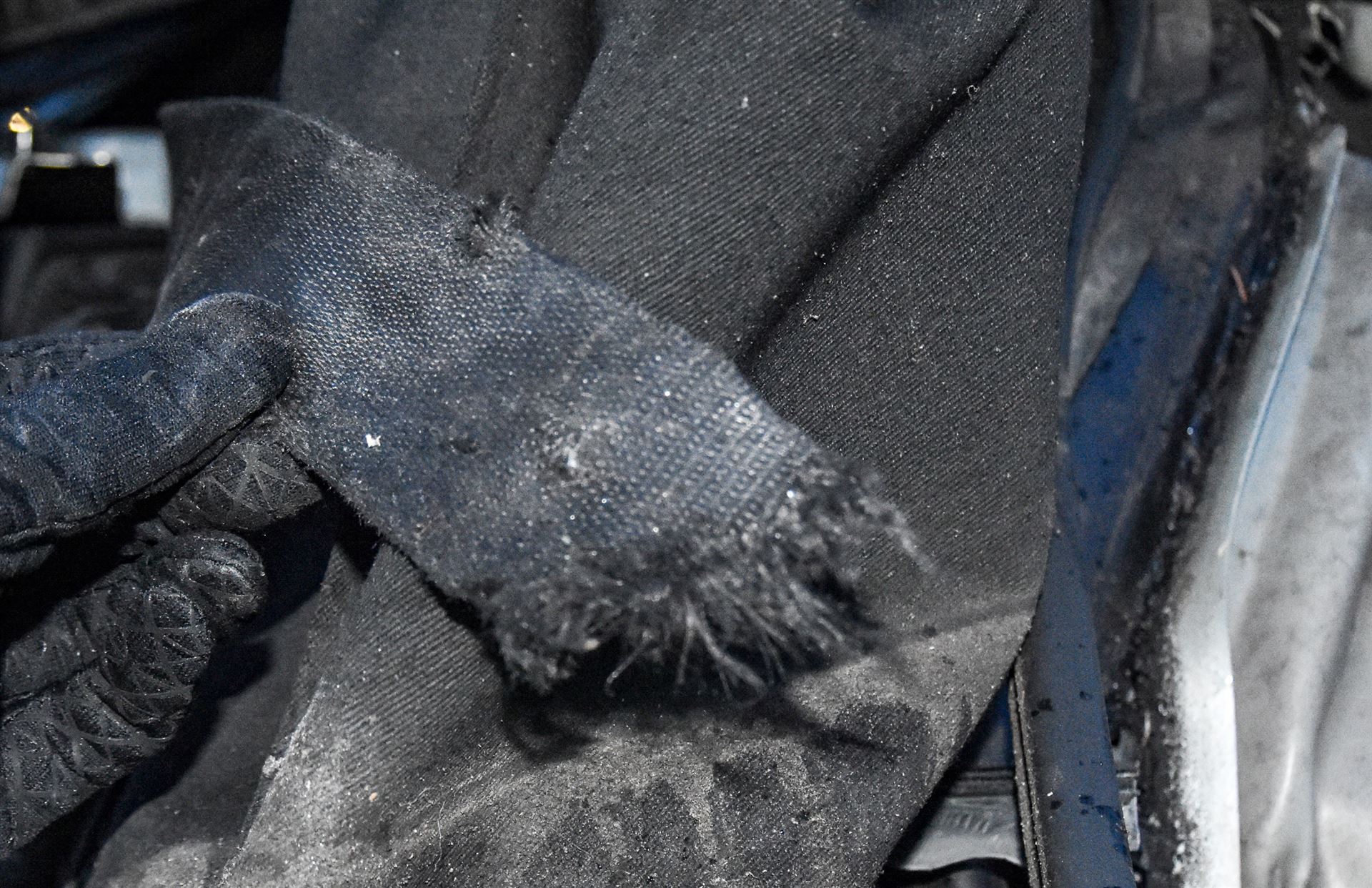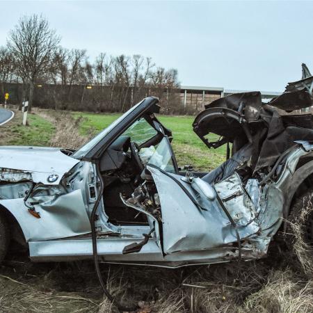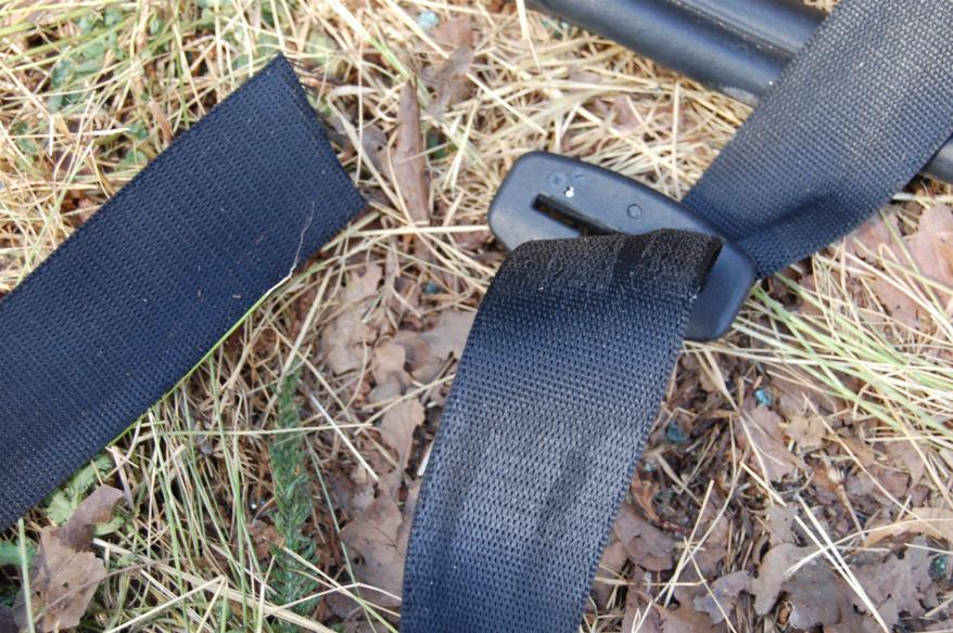 Eine Besonderheit hatte sich bei dem nachfolgend dargestellten Unfallgeschehen abgespielt: durch die Wucht der seitlichen Kollision mit einem Straßenbaum wurde das Gurtband vom Sicherheitsgurt des Fahrersitzes durchgerissen; möglicherweise begünstigt durch die scharfkantigen Karosserieteile, die sich durch die Kollision aufgefalzt hatten. Die Gurtzunge steckte noch im Gurtschloss; das Gurtband wies deutliche Anschmerzspuren auf.